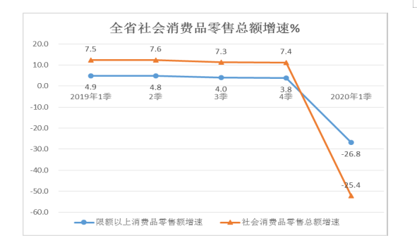 (三)居民外出购物就餐减少,但基本生活水平没有降低。疫情影响下,百姓“宅”家为首选生活方式,除购买生活必需品外,休闲购物、外出就餐急剧减少,会议婚宴等集聚活动基本暂停。从消费形态看,一季度,全省实现餐饮收入172.16亿元,同比下降37.4%,增速较上年同期降低47.7个百分点;全省实现商品零售2457.04亿元,同比下降23.8%,增速较上年同期回落24.5个百分点。从限额以上单位商品类值看,一季度,粮油类同比下降1.5个百分点;肉禽蛋类同比增长59.3%,蔬菜类同比增长5.0%。反映出疫情期间粮油食品类商品消费需求未有减弱,肉禽蛋和蔬菜消费需求增长,餐饮外卖成为餐饮消费主要形式,居民基本生活水平没有降低。