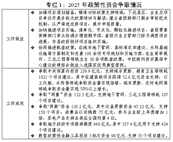 (一)打好“十四五”收官战,深入谋划“十五五”发展。经济向好势头不断巩固。省委和省政府靠前部署,召开深化“三个年”活动打好重点领域攻坚硬仗动员会、高质量项目建设推进会、市委书记工作汇报会、县(市、区)委书记工作交流会等,安排当前和下一阶段重点工作。强化穿透式调度,千方百计挖增量、优存量、强动能,推动经济实现量质齐升。政策效能加快释放。紧抓国家宏观政策调控机遇,坚持以“四个走出去”为抓手,积极到国家部委争取支持,联合部门、市县、高校企业合力争取资金,全年落地中央政策性资金582.4亿元,较上年增长80.4%,取得历史性突破,其中中央预算内投资、“两重”资金、“两新”资金规模分别增长64.8%、23.8%、71%,落实地方政府专项债券额度940亿元,新型政策性金融工具投放90亿元。稳妥实施国家育儿补贴政策,新增发放创业担保贷款48.96亿元。完善银行贷款风险补偿机制,引导发放贷款844亿元。建立健全宏观政策取向一致性评估工作机制,对235份政策文件出具评估意见。“十五五”规划编制有力推进。准确把握“十五五”发展阶段性特征,开展大调研、大座谈、大走访,常态化对接国家部委、省级部门、高校企业、基层单位等,深入研究“十五五”时期发展目标、重点任务、重大工程。先后组织高水平专家学者研讨、行业企业调研、片区部门座谈、网络意见征集等活动,充分吸纳各方面意见建议1600余条,形成规划《纲要(草案)》。