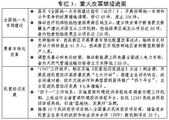 (四)进一步全面深化改革,市场活力不断增强。服务和融入全国统一大市场建设稳步推进。坚持“五统一、一开放”,出台综合整治“内卷式”竞争若干措施,与山西共同推出6方面30项市场一体化协作事项。持续开展不当干预市场纠治和隐性壁垒清理整治,废止或修订155件不合规招商引资政策、105件涉市场准入文件,扎实开展招标投标领域突出问题系统整治。重点领域改革取得新进展。“高效办成一件事”上线运行39项,国企改革行动任务全面完成,圆满完成农业水价综合改革任务。印发深化开发区改革实施方案,开发区和工业园区从162家整合到123家,供应工业用地“标准地”2.45万余亩。榆林“标准地”和“先租后让”改革取得新成效,西咸新区技术交易额达205亿元。营商环境持续优化。省级民营经济发展局挂牌成立,举办民营经济创新发展大会,构建一部法律、七大行动、四个平台、七条措施“1747”工作抓手,建立问题收集—交办—跟踪闭环和专业问题研究解决机制,形成营商环境一品牌、一机制、一平台、一热线“四个一”工作体系,推出190项“小切口”创新任务,常态化通报负面典型案例22起。发布全国首部省级《政务诚信评价规范》地方标准。