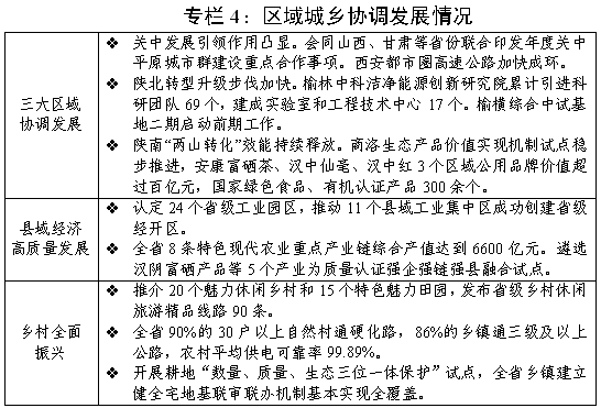 (六)以协调发展促进城乡融合和区域联动,经济布局更趋优化。区域发展均衡性不断增强。统筹推进关中平原城市群、西安都市圈、西安—咸阳一体化发展,关中平原城市群119项政务服务实现“跨省通办”,出台加快西安—咸阳一体化进程等政策措施,支持西咸新区谋划推进智能电器、工业母机、低空经济等7个产业创新集群。榆林中科洁净能源创新研究院获批省级院士工作站,支持延安现代能源经济示范区建设。出台支持陕南地区高质量发展的意见,山阳、佛坪等5个陕南地区抽水蓄能项目加快建设。2024年度国家东西部协作考核我省取得“好”等次。县域经济持续壮大。印发大力推动县域特色产业集群高质量发展实施方案,经济总量200亿元以上县域新增2个、达到29个,特色主导产业总产值突破1.5万亿元。印发促进“飞地经济”发展的若干举措,首家县域“飞地实验室”在西安交大创新港建成落地。乡村振兴全面推进。深入实施以人为本的新型城镇化战略五年行动,启动推进14个县第二轮土地承包到期后再延长30年整县试点,初步建立耕地、永久基本农田和高标准农田一体化管理机制,新建和改造高标准农田94.18万亩。举办上合组织减贫和可持续发展论坛,农村自来水、卫生户厕普及率分别超过98%、85%。眉县、大荔等4个县被确定为国家乡村全面振兴工作联系点。