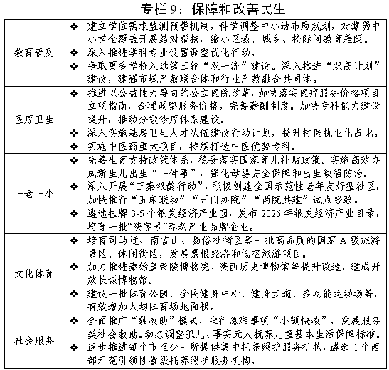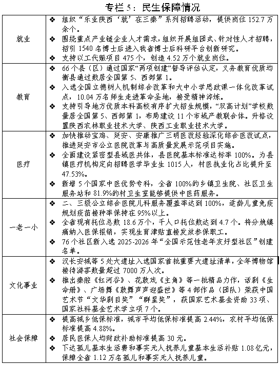 (八)切实办好民生实事,持续增进民生福祉。顺应人口发展趋势和结构变化,紧密结合“投资于物”与“投资于人”,加大对全人群、全生命周期人的能力提升和潜力开发的投入,高质量做好社会和民生各项工作。一是拓展居民就业增收渠道。实施稳岗扩容提质行动,加强就业增收监测分析,精准帮扶高校毕业生、农民工、退役军人等重点群体就业,加密线上线下招聘频次,稳定政策性岗位招录规模。持续实施职业技能提升、劳务品牌培育、就业服务提质“三项工程”,做好新就业形态人员职业伤害保障试点,强化公共实训基地项目建设管理。落实好国家城乡居民增收计划各项部署,制定落实方案和责任清单,确保增收取得实效。发挥以工代赈项目带动就业作用,确保劳务报酬占比不低于40%。二是推进公共服务优化布局。建立完善学位需求预测预警机制,增加普通高中学位供给,协同推动义务教育优质均衡发展。实施好医疗卫生强基工程项目,推进西安交大一附院创建国家医学中心。充分释放文旅资源潜能,健全多部门协同推进机制,强化产业创新和资本支持,加快推进陕西文学馆、陕西美术馆等重点项目建设,新建或改扩建一批重大文化设施。落实好学前1年免保教费、育儿补贴、养老服务消费补贴等政策,有效降低家庭生育养育教育成本。深化殡葬行业改革,规范殡葬服务市场秩序。三是加强社会兜底保障。落实企业职工基本养老保险全国统筹有关部署安排,持续深化机关事业单位养老保险制度改革,推动城乡居民基本养老保险基金市级管理。深化失业、工伤保险省级统筹,鼓励支持灵活就业人员、新就业形态人员参加职工保险。稳步推进基本医保省级统筹,优化药品集采、医保支付、结余资金使用政策。建立与居民人均消费支出挂钩的低保标准量化调整机制,完善残疾人关爱服务体系,发展服务类社会救助。